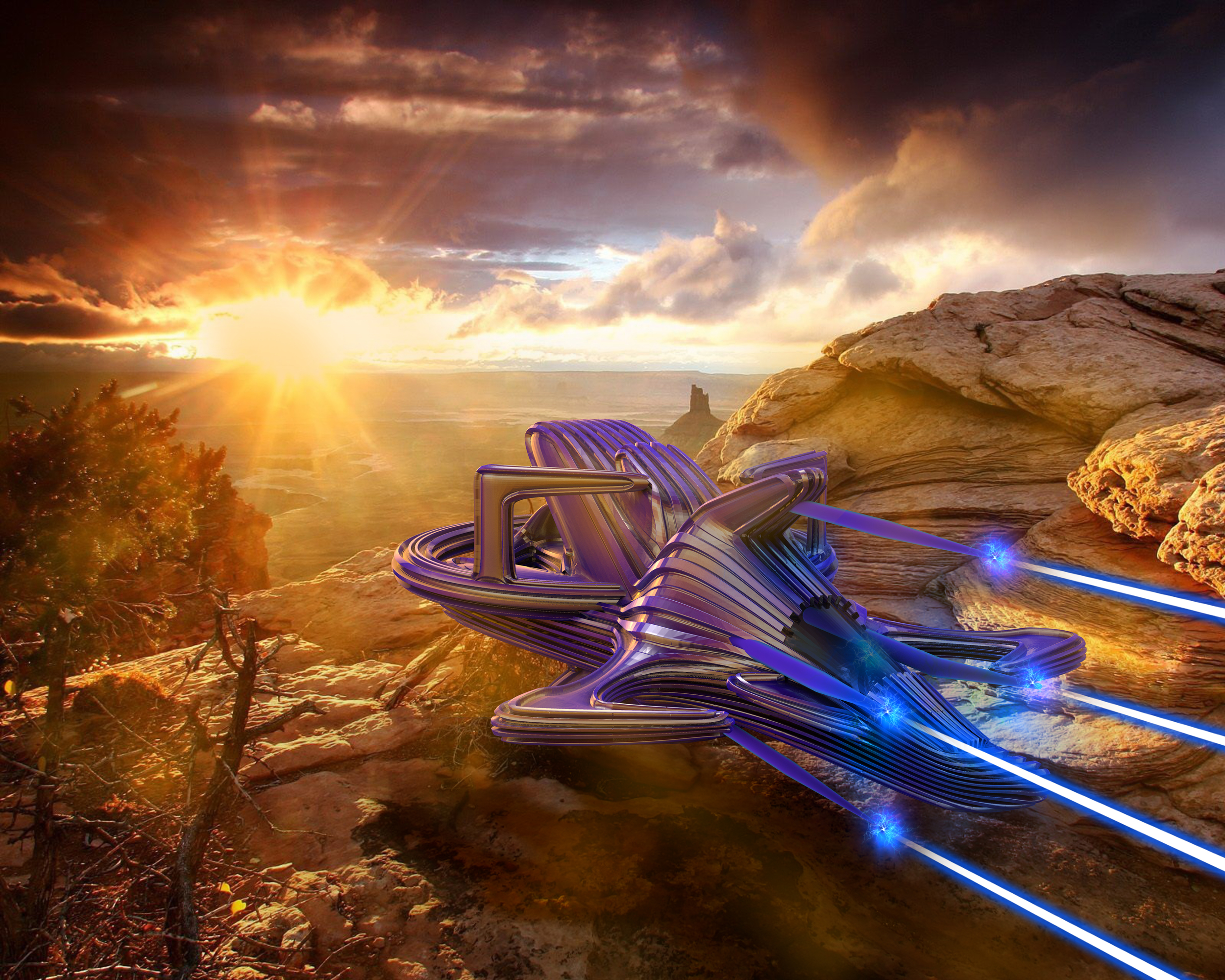 A spaceship called Lazer attacking the land! I created this poster to show my skills in rendering 3D objects in a realistic scenery. I used HDR images to light the spaceship to match the background. :)